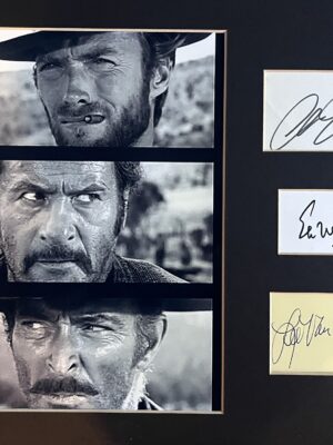 Clint Eastwood, Eli Wallach and Lee Van Cleef signature pieces mounted alongside 3 b/w photos – Mounted to approx size 16×12″