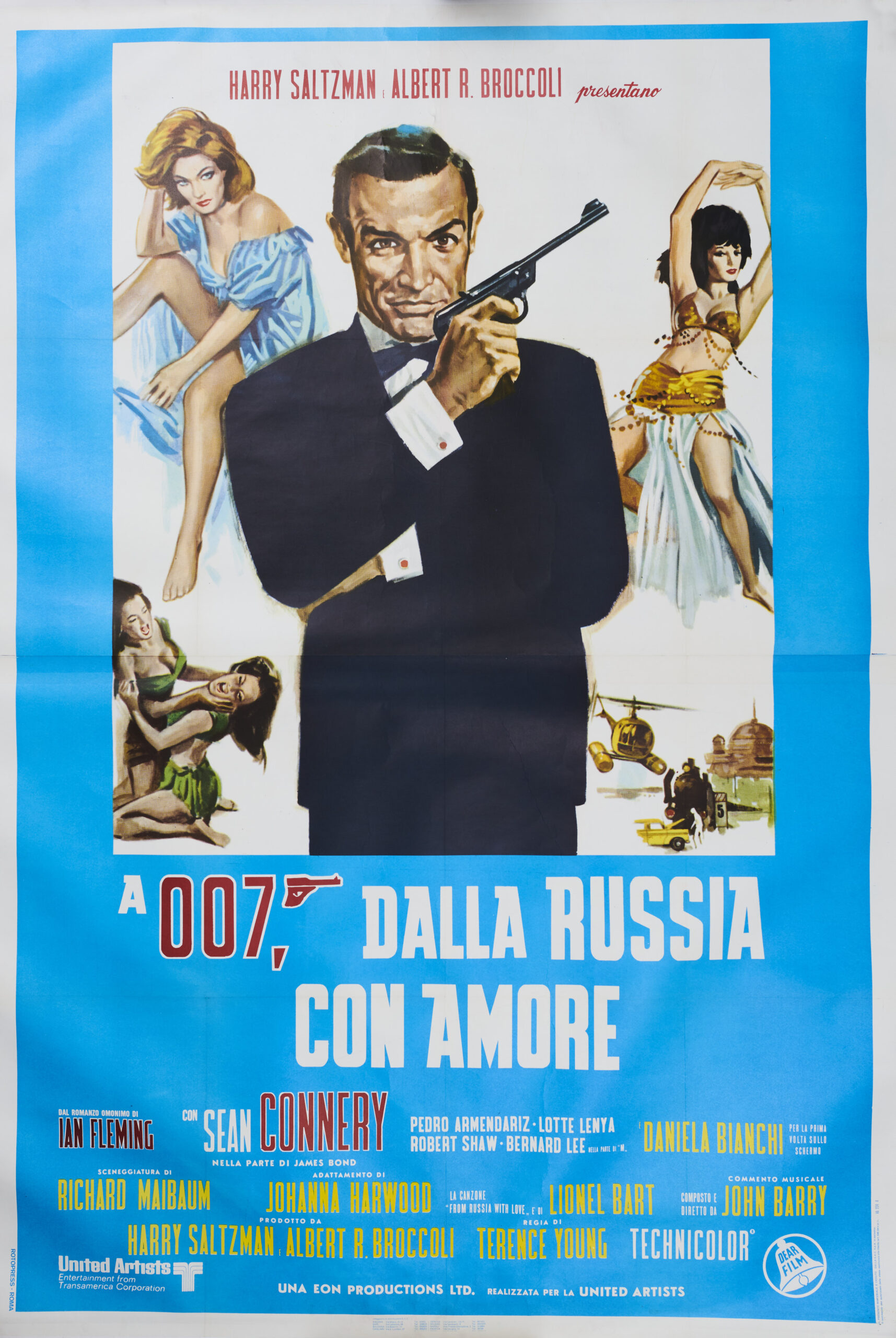 Ian Fleming’s From Russia with Love, the 1963 (released in the U.S. in 1964) Terence Young English James Bond 007 secret agent spy espionage fantasy action adventure thriller (“James Bond is back!”; “Meet James Bond, secret agent 007, His new incredible women… His new incredible enemies… His new incredible adventures…!”; “Target: The unkillable James Bond 007”; “Blast him! Seduce him! Bomb him! Strangle him!”; “The world’s masters of murder pull out all the stops to destroy Agent 007!”; “69,000,007 James Bond fans live in a throbbing world of hot-blooded excitement!”; “Don’t you think it’s time you met secret agent 007? Now his incredible women…his incredible enemies… his incredible new adventures explode on the screen!!!”; based on the famous novels by Ian Fleming) starring Sean Connery (“as James Bond”), Robert Shaw, Pedro Armendariz, Lotte Lenya, Bernard Lee (as “M”), Daniela Bianchi (billed as “and introducing Daniela Bianchi”; as Tatiana Romanova), Eunice Gayson, Nadja Regin, Lois Maxwell (as Miss Moneypenny), Water Gotell, Jan Williams, Lisa Guirautf, and Aliza Gur