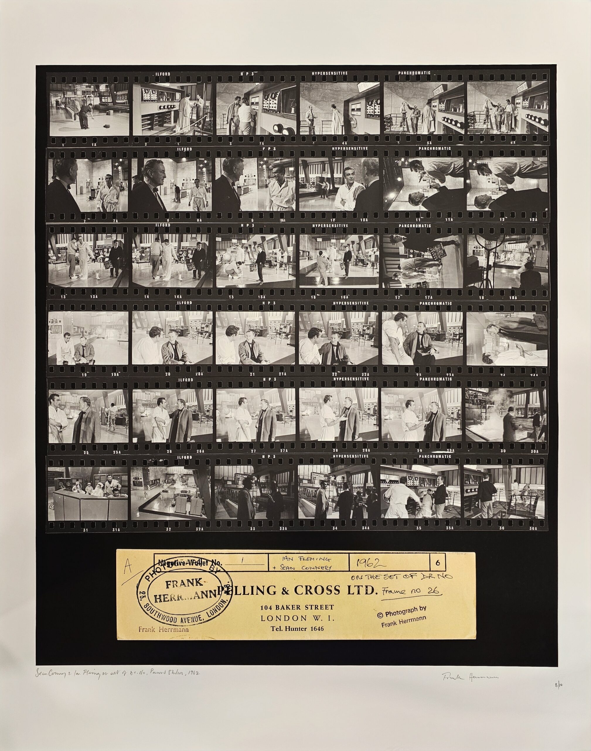 Sunday Times Staff photographer Frank Herrmann was sent to Pinewood Studios in Buckinghamshire on March 22nd, 1962, to capture the moment Sean Connery met with James Bond’s creator Ian Fleming. The first of the hugely successful series. Herrmann was allowed to stay and record the action sequences for the final scenes being filmed that day. These scenes and the Connery and Fleming meeting are recorded on the contact sheet here. Before digital cameras, a roll of 36 photographs would be processed to produce a strip of negatives. These negatives would be developed, fixed and dried to make a’positive’ set of images on photographic paper, allowing easy reference for choosing which photographs to use. Printed on Hahnemuhle Photo Rag 308gsm fine art paper, each print is embossed with the photographer’s stamp, signed and hand-numbered #8/10.