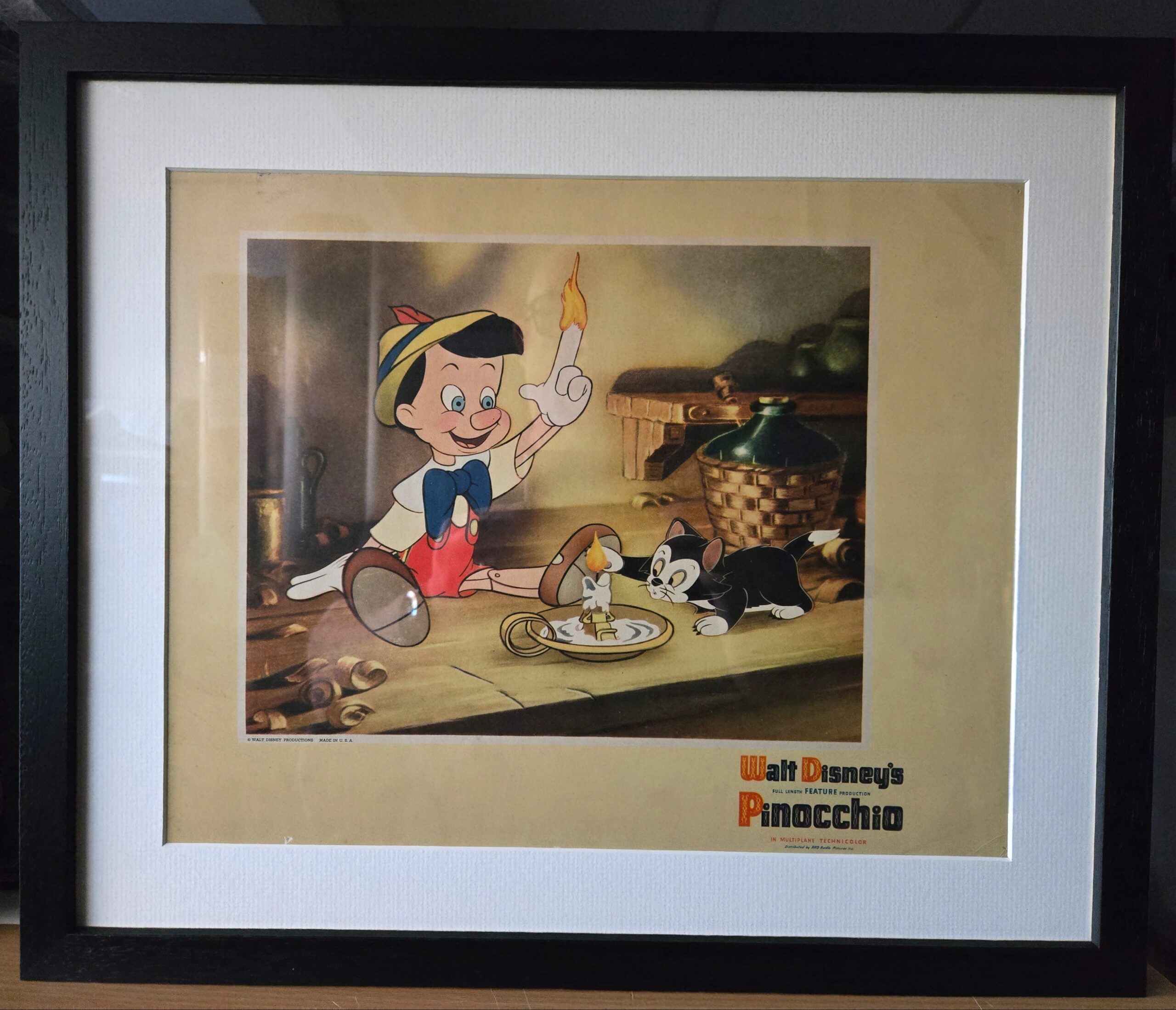 This charming lobby card features Pinocchio and Geppetto’s cat, Figaro. It is unrestored and shows light, sporadic edge wear, corner pinholes, and creases in the upper corners and border. However, the colors remain fresh and vibrant.