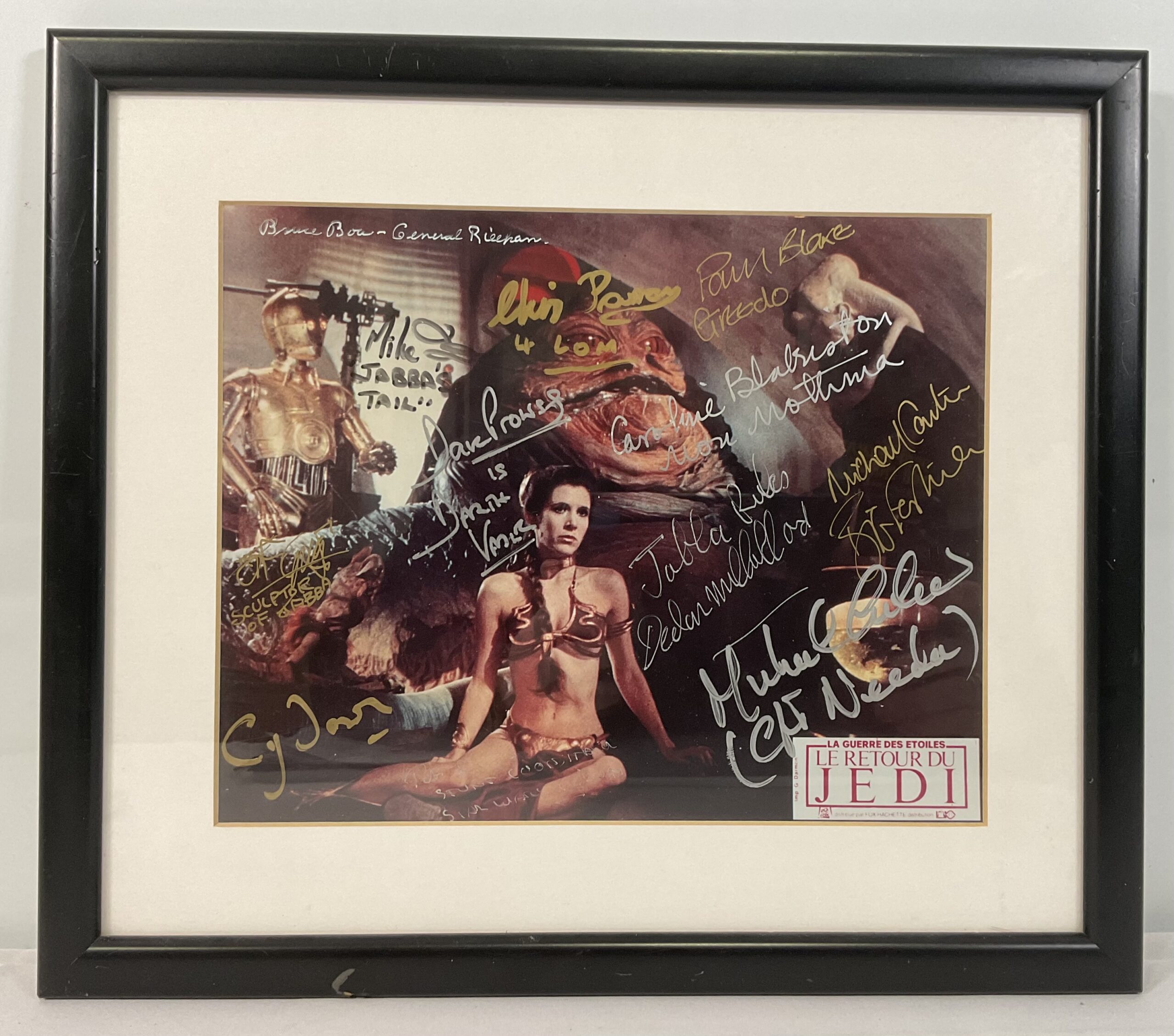 STAR WARS – A multi signed French promotional still of Princess Leia, captured by Jabba in STAR WARS EPISODE VI: RETURN IF THE JEDI signed by DAVE PROWSE (Darth Vader), CAROLINE BLAKISTAN (Mon Mothma), PAUL BLAKE (Greedo), MICHAEL CULVA (Captain Needa), DECLAN MULHOLLAND (Jabba the Hutt stand in), MIKE EDMONDS (Jabba’s Tail), JOHN COPPINGER (Jabba sculptor), PETER DIAMOND (Stunt Coordinator/ Actor), BRUCE BOA (General Rieekan), CHRIS PARSONS (4 Lam), MICHAEL CARTER (Bib Fortuna), etc… in black plastic frame with plastic glaze, 31cm / 26.5cm.