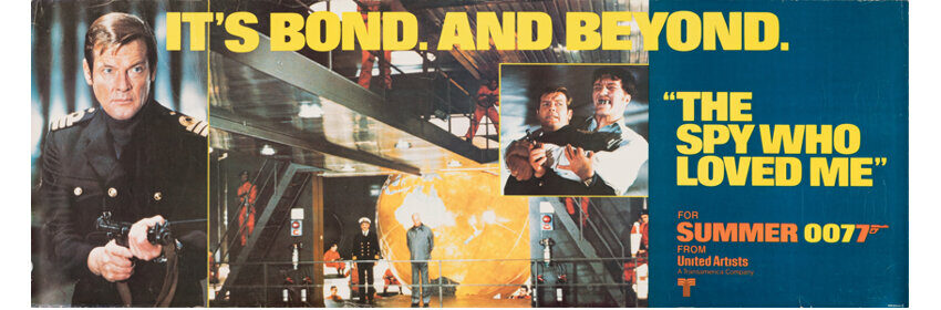 Starring Roger Moore, Barbara Bach, Curt Jurgens, Richard Kiel, Caroline Munro, Bernard Lee, Desmond Llewelyn, Lois Maxwell, Sue Vanner, Edward de Souza, Geoffrey Keen, and Walter Gotell. Directed by Lewis Gilbert. Unrestored banners that display signs of use. May include light edge small chips, minor tears, pinholes, paper lifts, surface scuffs, and significant creases. One banner shows cellophane tape remnants in the borders.