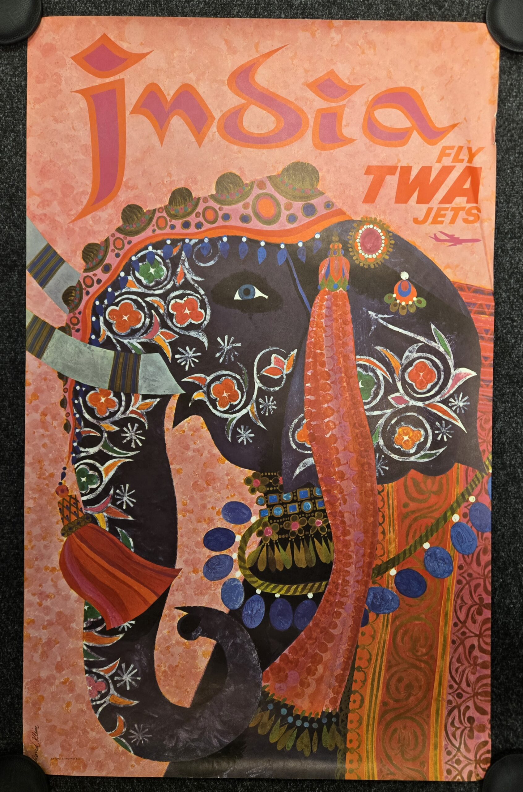 TWA: India, the 1960s airline airplane aviation travel poster (“Fly TWA jets”) encouraging people to use TWA (Trans World Airlines) when traveling to India, and featuring David Klein artwork of an elephant.